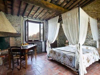 Ambiente unico con letto matrimoniale a baldacchino, angolo cottura attrezzato, bagno con doccia.