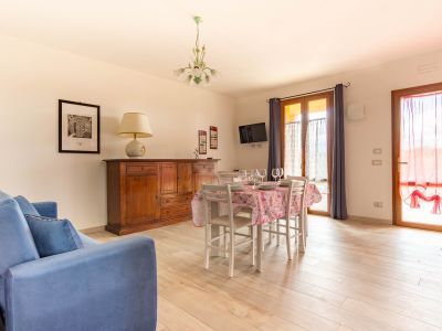 L'ampio soggiorno arredato con tavolo per 6/8 persone dispone anche di divano letto matrimoniale. La cucina, dotata di tutti i comfort con piano a induzione, forno e lavastoviglie. La zona giorno si affaccia su un ampia terrazza attrezzata con tavolo, sedie e divanetti.