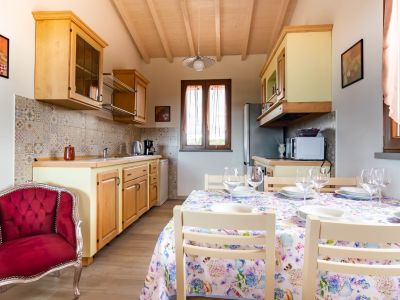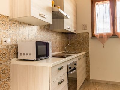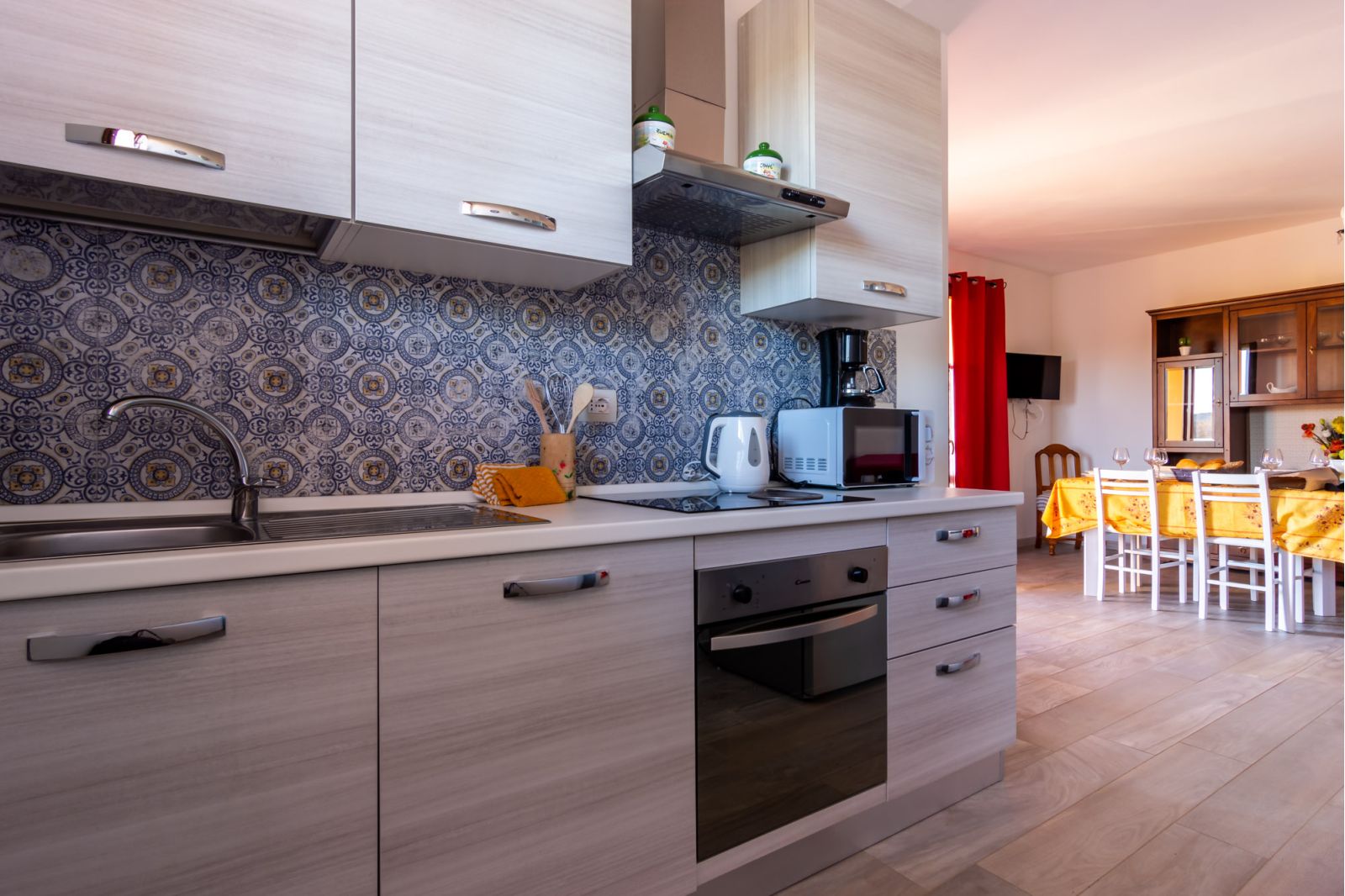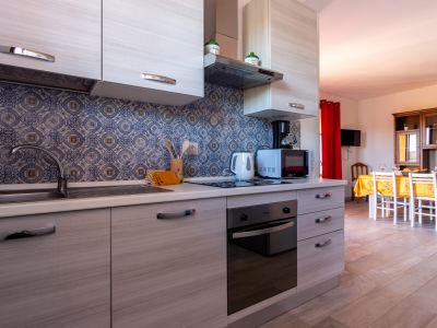 Die Dreizimmerwohnung im ersten Stock besteht aus einem Schlafzimmer mit Doppelbett, einem zweiten Schlafzimmer mit der Möglichkeit von getrennten Betten, einem großen Wohnzimmer mit Küche und einem Badezimmer.