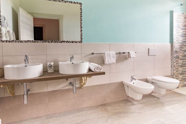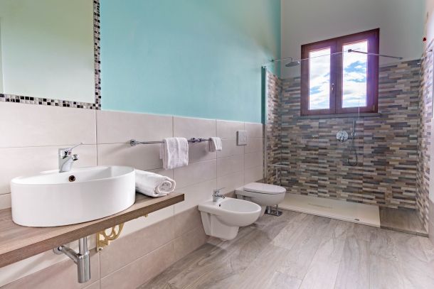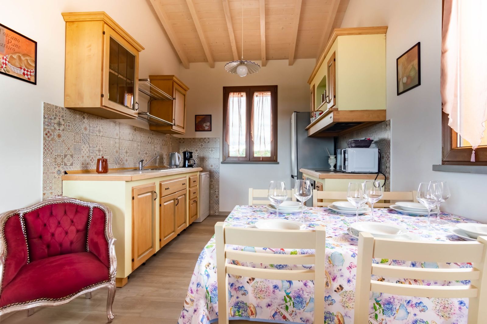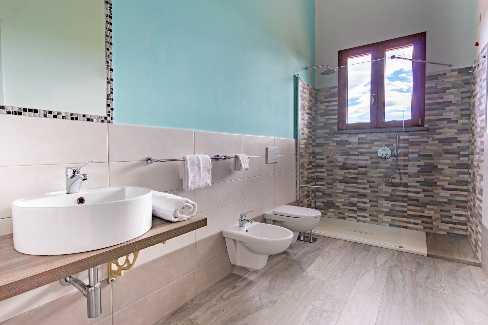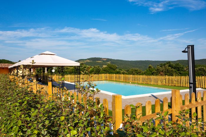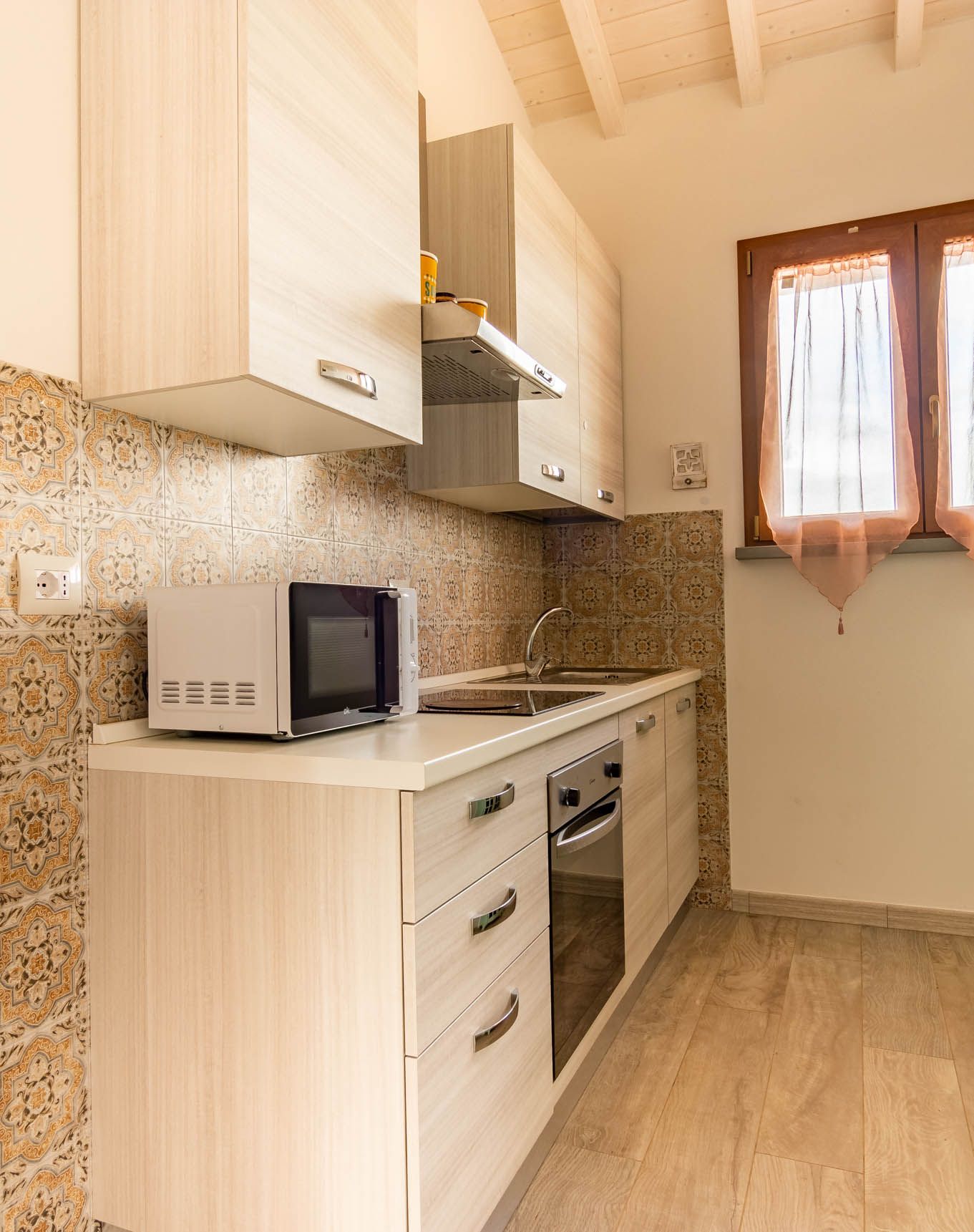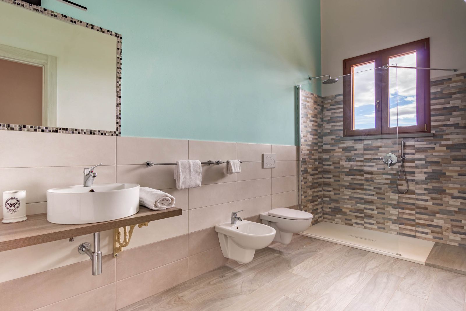 Im Hauptgebäude 'Poggiata' befinden sich drei Dreizimmerwohnungen, zwei im Erdgeschoss und eine im ersten Stock. Die beiden Dreizimmerwohnungen im Erdgeschoss haben zwei Schlafzimmer und zwei Bäder, während die Wohnung im ersten Stock ein großes Einzelbad hat.